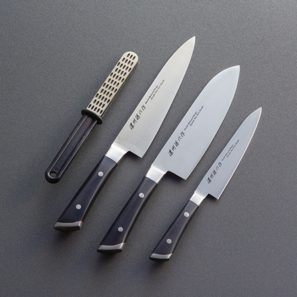 三徳包丁(刃渡17cm)・牛刀包丁(刃渡18cm)・ペティナイフ(刃渡13.5cm)・シャープナー(全長20.5cm)×各1・包丁:モリブデンステンレス刃物鋼、柄:ABS、シャープナー:工業用ダイヤモンド・スチール・ABS