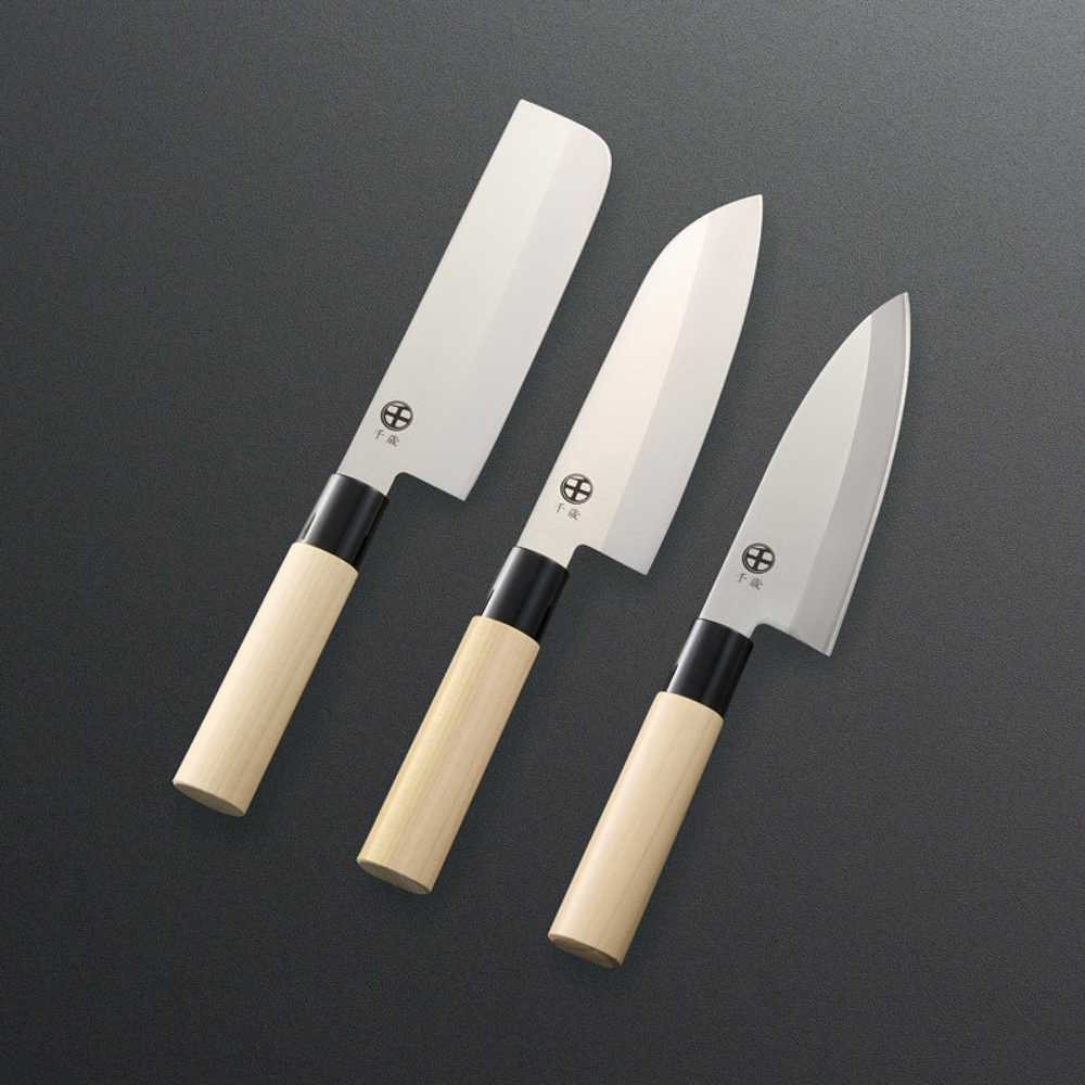 | 内容量 | 万能包丁(刃渡15.5cm)・菜切包丁(刃渡15cm)・出刃包丁(刃渡14.5cm)×各1・刃部:モリブデンバナジウム鋼、柄:木、桂:PP |