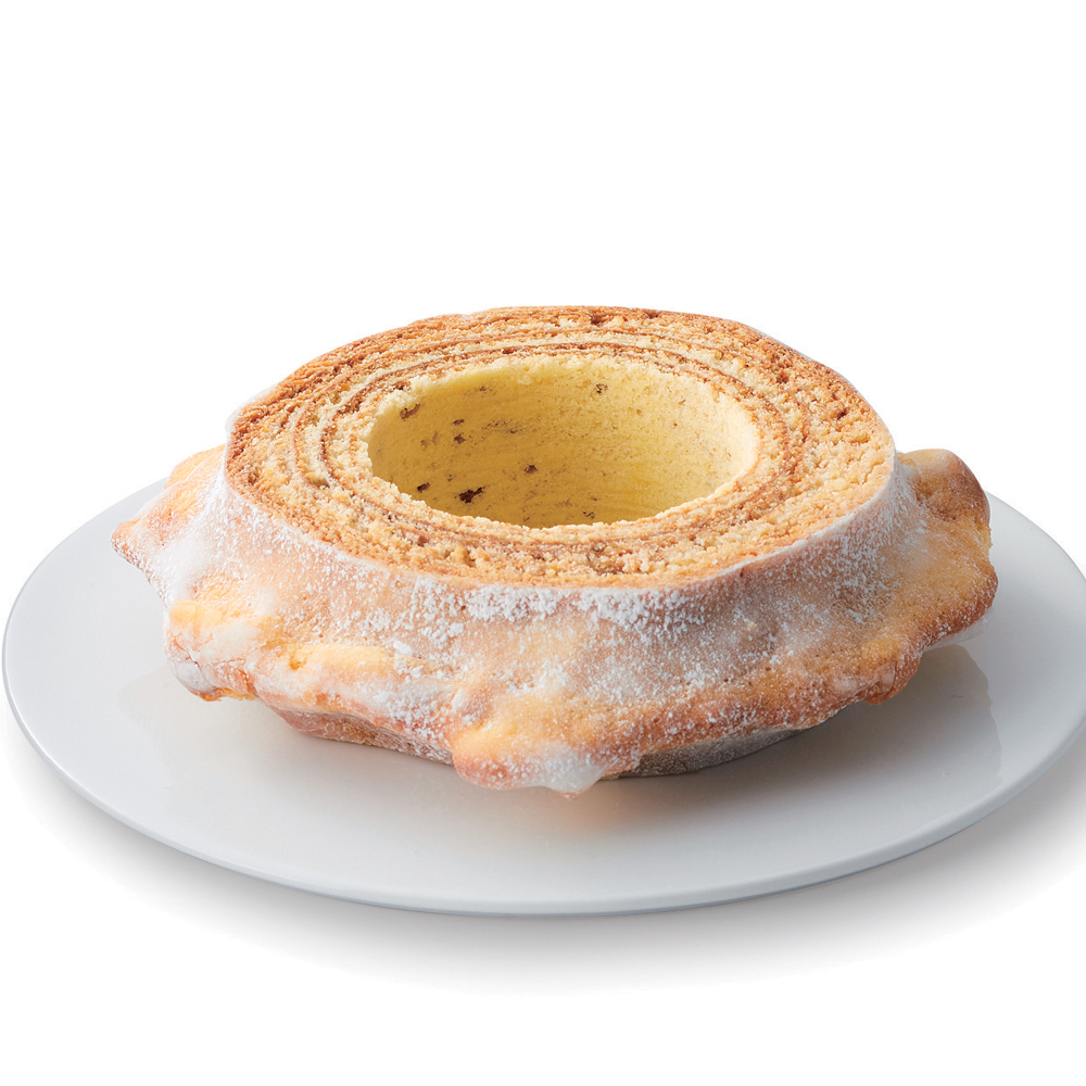 レモンピール(レモンの果皮を砂糖みつで煮詰めて乾燥させたもの)が入った爽やかなレモンの風味感じる丸型バウムクーヘン。