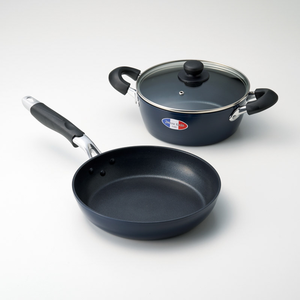 | 内容量 | 両手鍋20cm(21×33×15cm・2.3L)・フライパン24cm(径24cm)×各1・両手鍋:(本体)アルミニウム合金(内面フッ素樹脂加工・外面焼付塗装)・(取っ手・ツマミ)フェノール樹脂・(フタ)強化ガラス・(フタ金属部)ステンレス、フライパン:(本体)アルミニウム合金(内面フッ素樹脂加工・外面焼付塗装)・(取っ手)フェノール樹脂 |