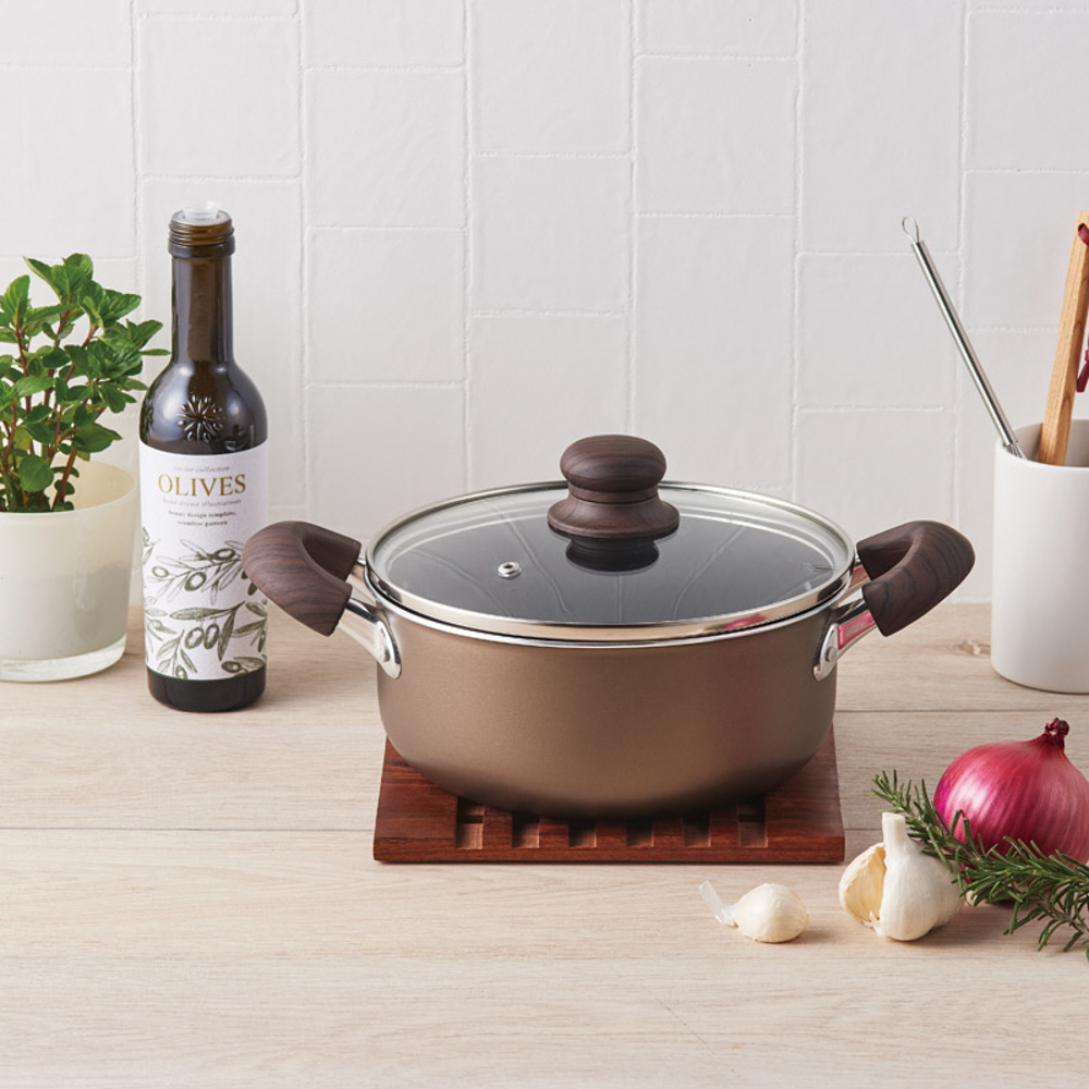上品なブラウン調の外面と、木目の転写加工を施したハンドルが特徴的な高級感のあるアルミ製クックウェア。