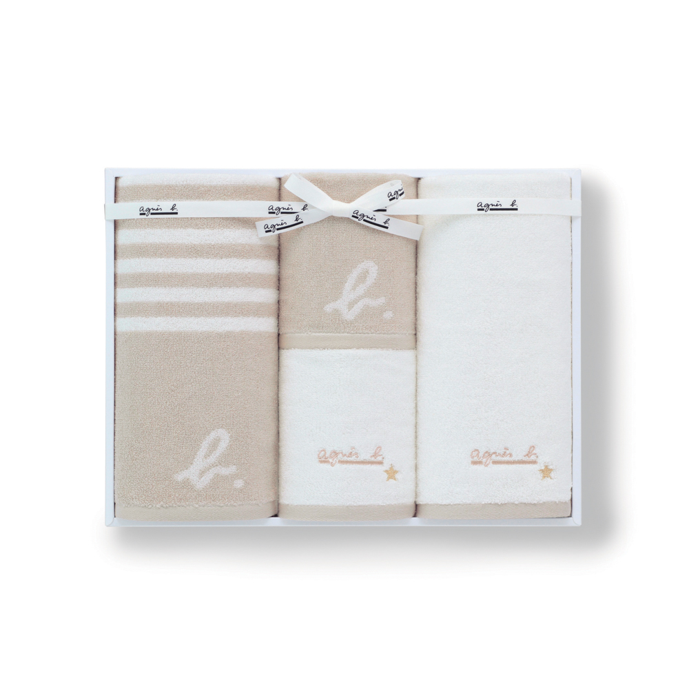 アニエスベーのアイコンのボーダーとブランドロゴのb.を配したジャカードタオルと、ロゴ刺繍がポイントのホワイトタオルを詰め合わせました。