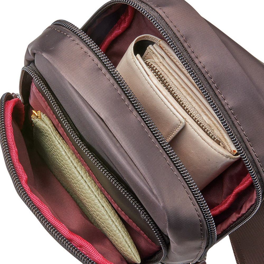 内オープンポケット×1室、前面ファスナーポケット×2室。