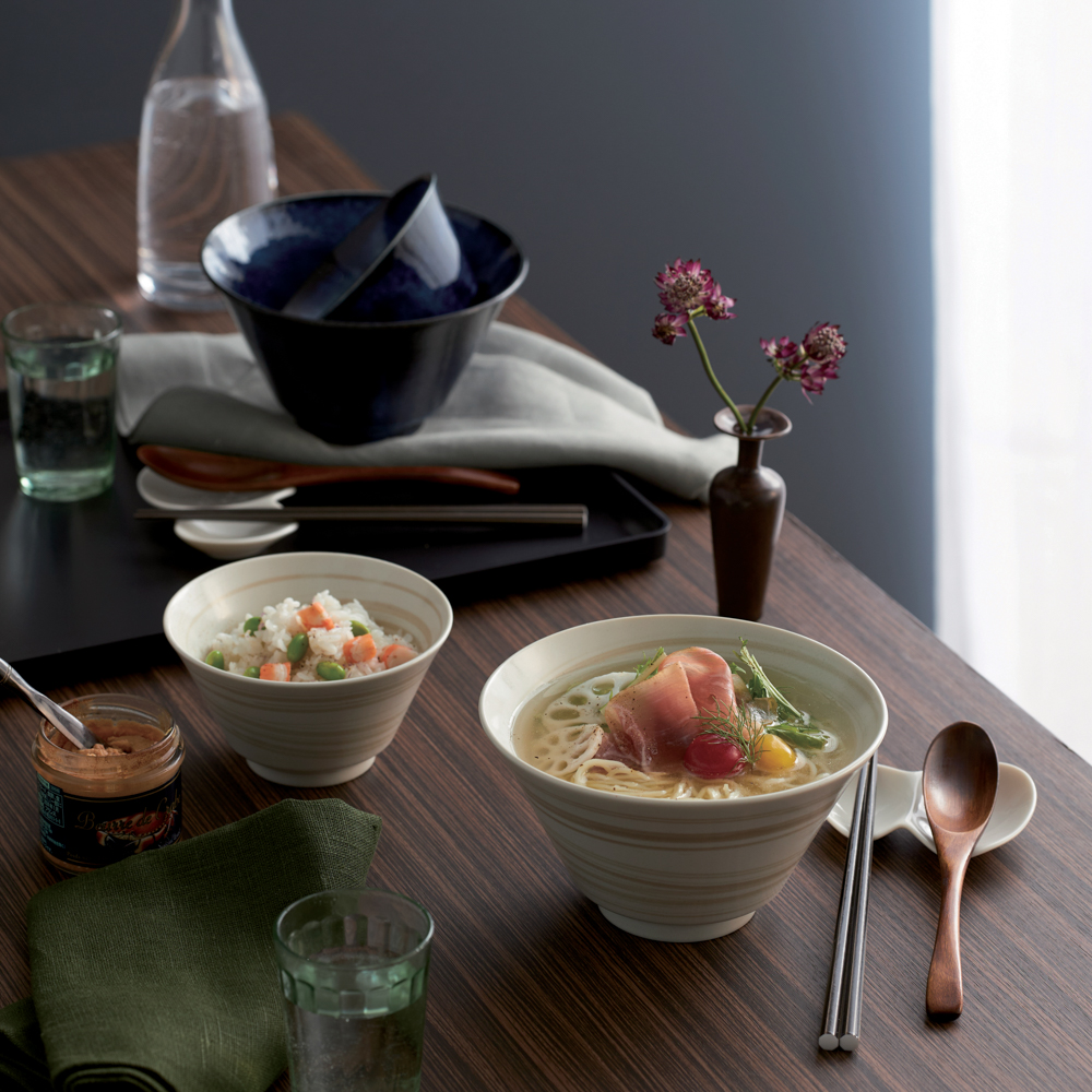 | 内容量 | 丼:φ17×高さ9.5㎝(900㎖) 取り分け丼:φ13×高さ7㎝(400㎖) 薬味皿:10×8×高さ1.5㎝ 箸:22.5㎝ 木製スプーン:19.5㎝ 各1 |
