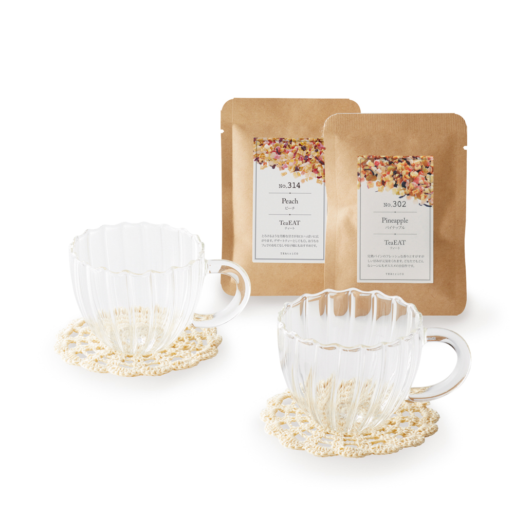 | 内容量 | カップ:φ7.5×高さ5.9㎝(190㎖)・コースター:φ9.5㎝×各2 フルーツティー(パイナップル・ピーチ)×各10g |