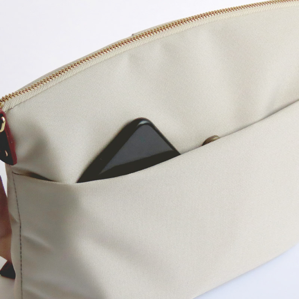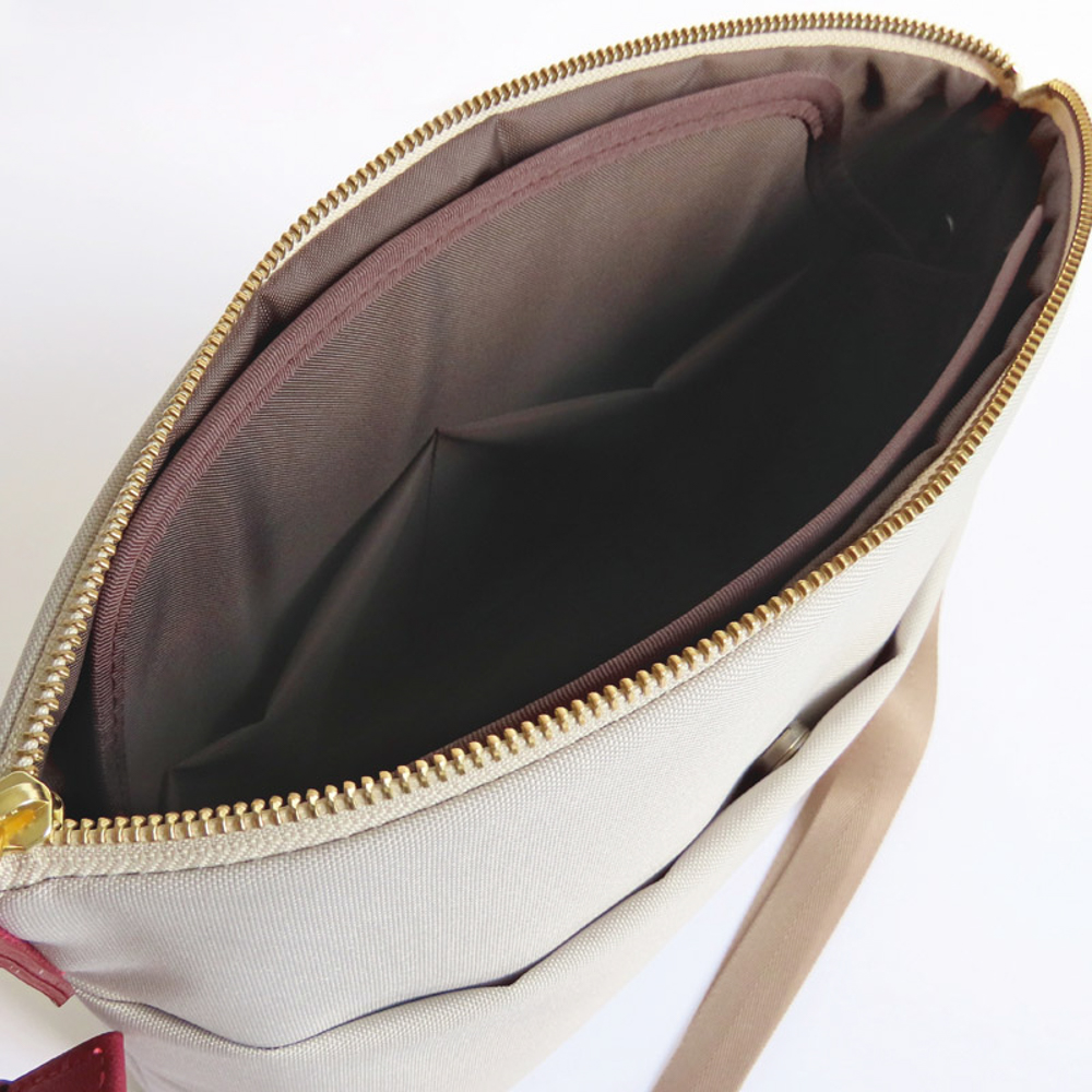 カメラバッグにも使われる素材の芯材パーツを中に入れることで、ポリエステル製のバッグにもかかわらず、シャキッと自立して使いやすい。