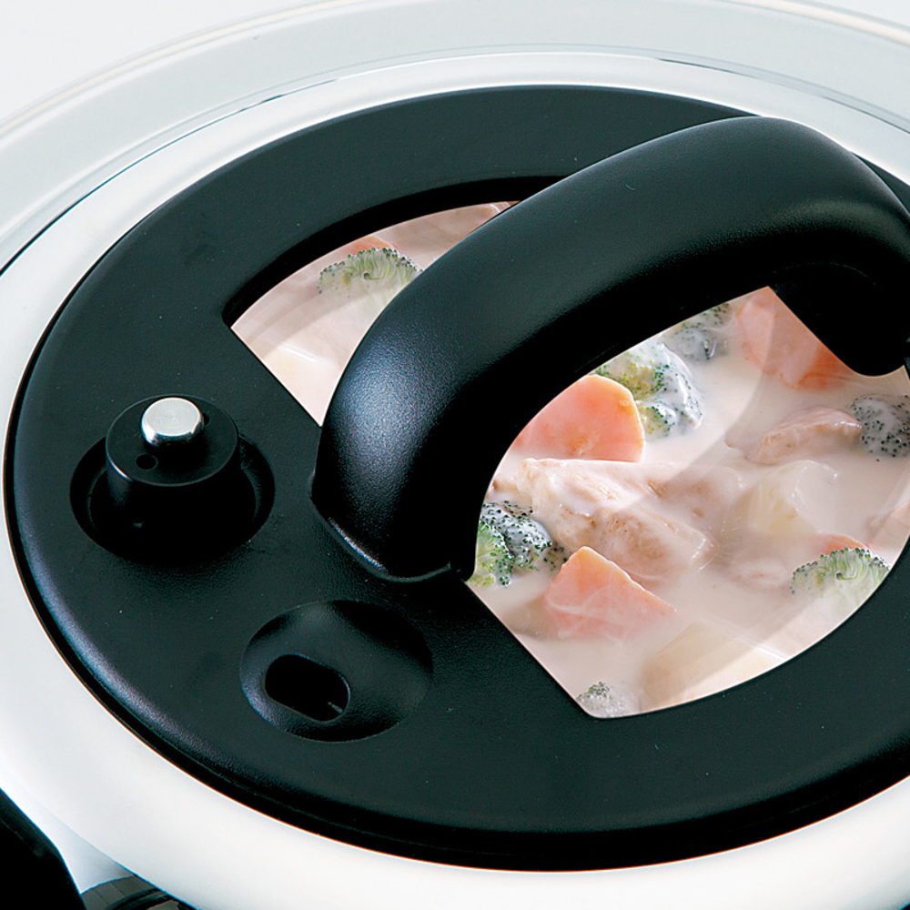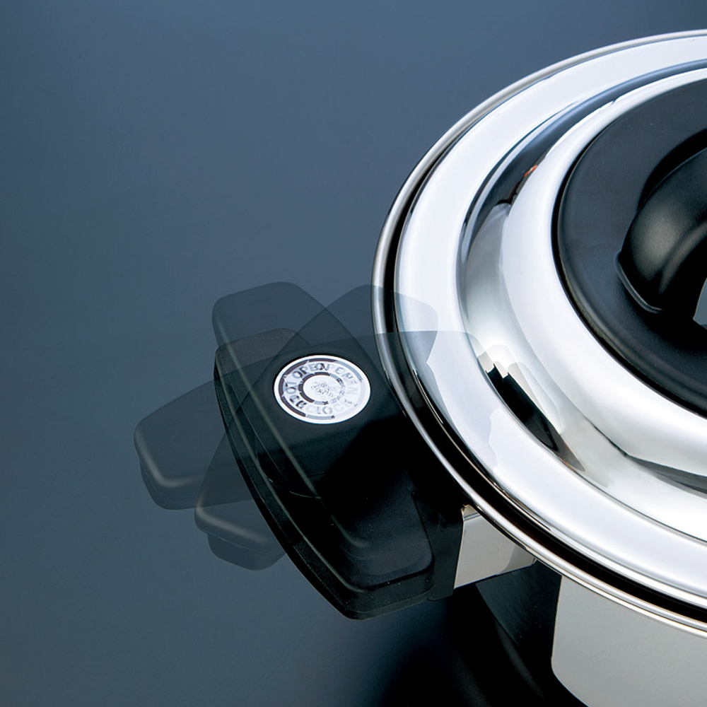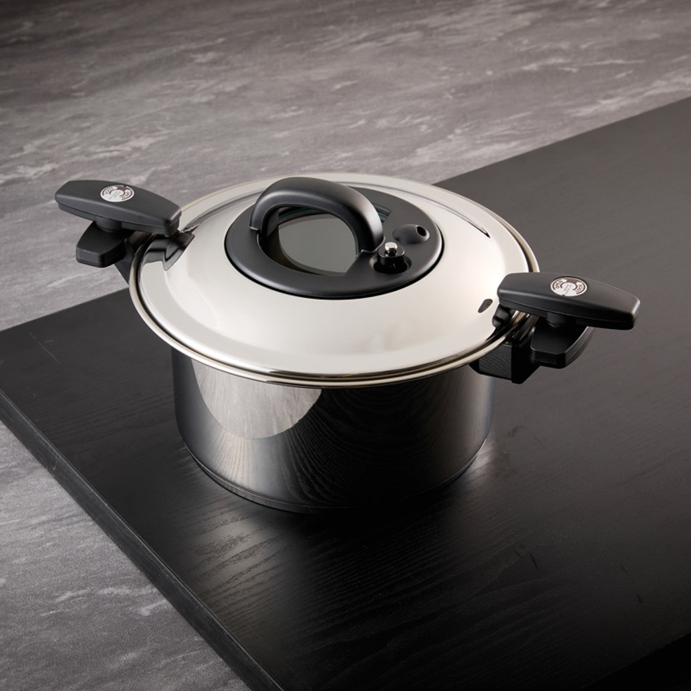 圧力鍋とは違いやさしい圧力で調理する調圧鍋です。普通の鍋に比べて根菜類はもちろん、肉や豆などスピーディーに軟らかく煮る事が出来ます。途中で蓋を開けて味見をする事も可能です。