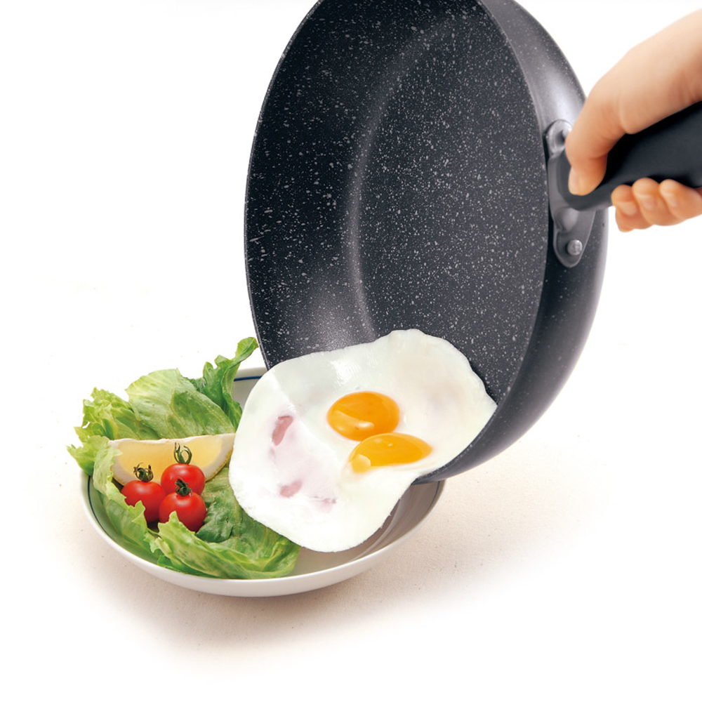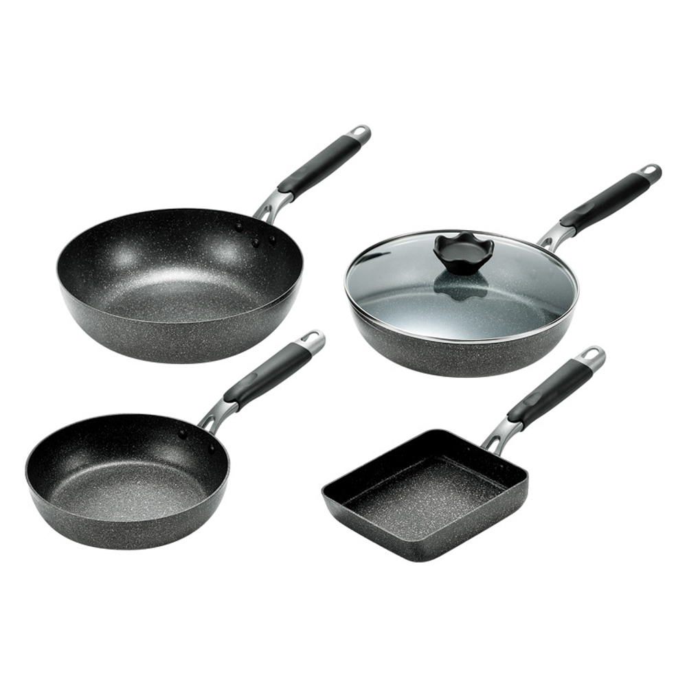 | 内容量 | フライパン(径26cm・径20cm)・いため鍋28cm(28.3×49.5×12.8cm)・玉子焼(13×18cm)×各1・本体:アルミニウム合金(内面フッ素樹脂塗膜加工)、底部:ステンレス、蓋:強化ガラス |