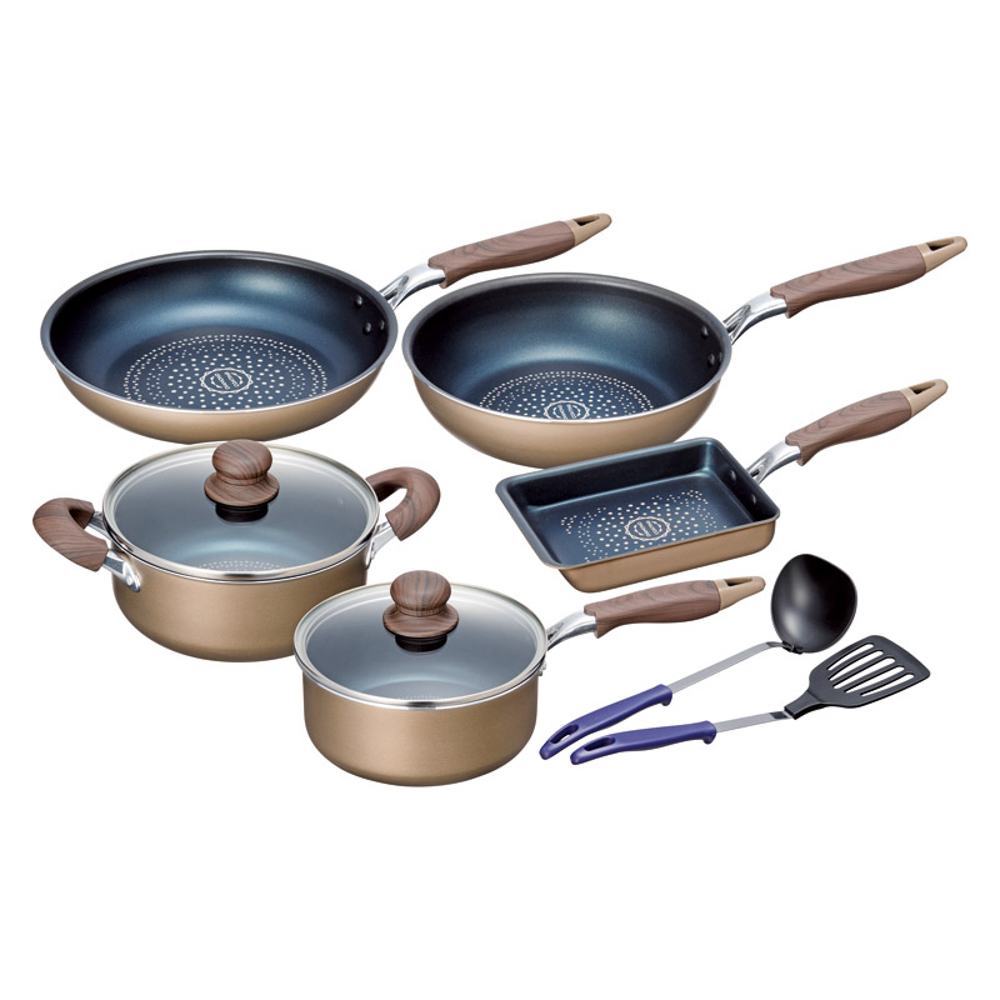 | 内容量 | 両手鍋20cm(21.5×32.5×15cm・2.7L)・片手鍋18cm(19.5×37.5×14cm・2L)・玉子焼(13×18cm)・ディープパン24cm(25.5×45.5×14cm・2.8L)・フライパン(径26cm)・お玉・ターナー×各1・本体:アルミニウム合金、底面:ステンレス鋼、内面:フッ素樹脂加工(ダイヤモンドコート)、外面:焼付塗装、蓋:強化ガラス |