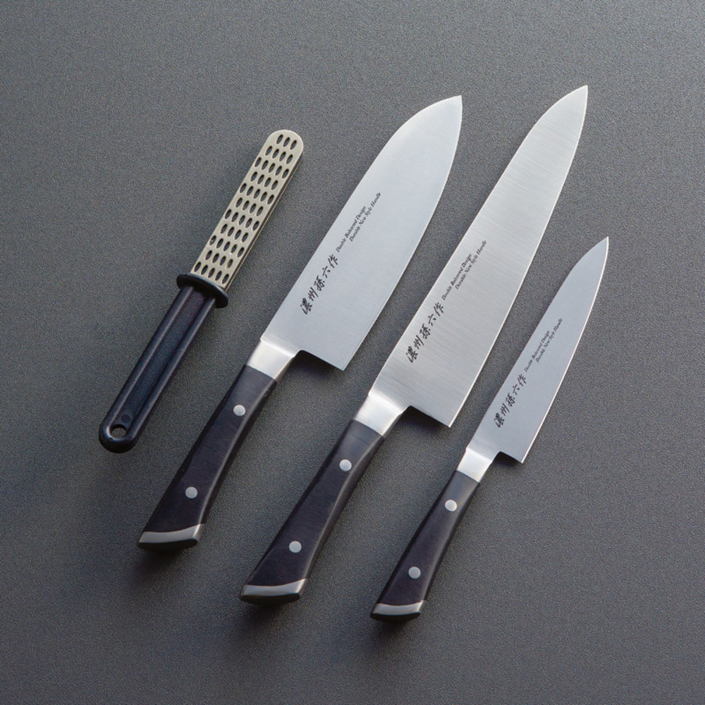 三徳包丁(刃渡17cm)・牛刀包丁(刃渡21cm)・ペティナイフ(刃渡13.5cm)・シャープナー(全長20.5cm)×各1・包丁:モリブデンステンレス刃物鋼・(柄)ABS、シャープナー:工業用ダイヤモンド・スチール・ABS