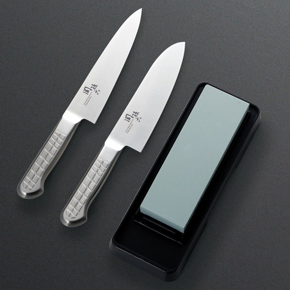 衛生的なオールステンレス製の日本製包丁2本と砥石のセット。