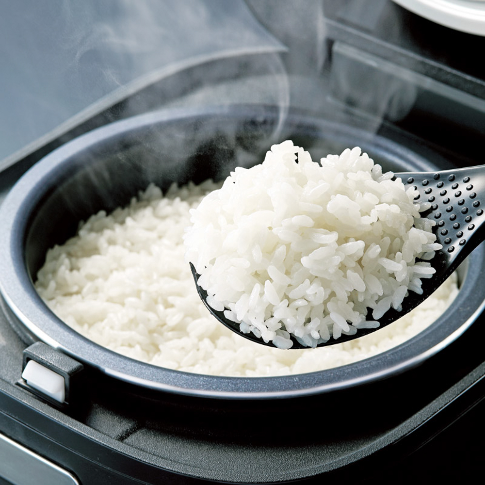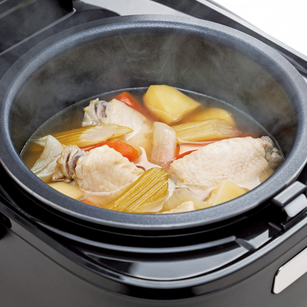厚さ約3mmの遠赤黒特厚釜による高い蓄熱性と遠赤効果で炊きムラを抑えて、ふっくらおいしいごはんを炊き上げます。時短調理から本格調理、レトルト食品のあたためもできます。コードの長さ約1.2m。消費電力350W。