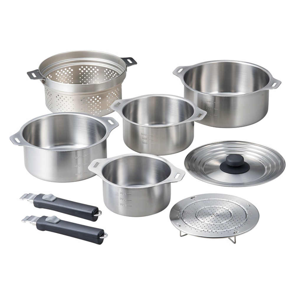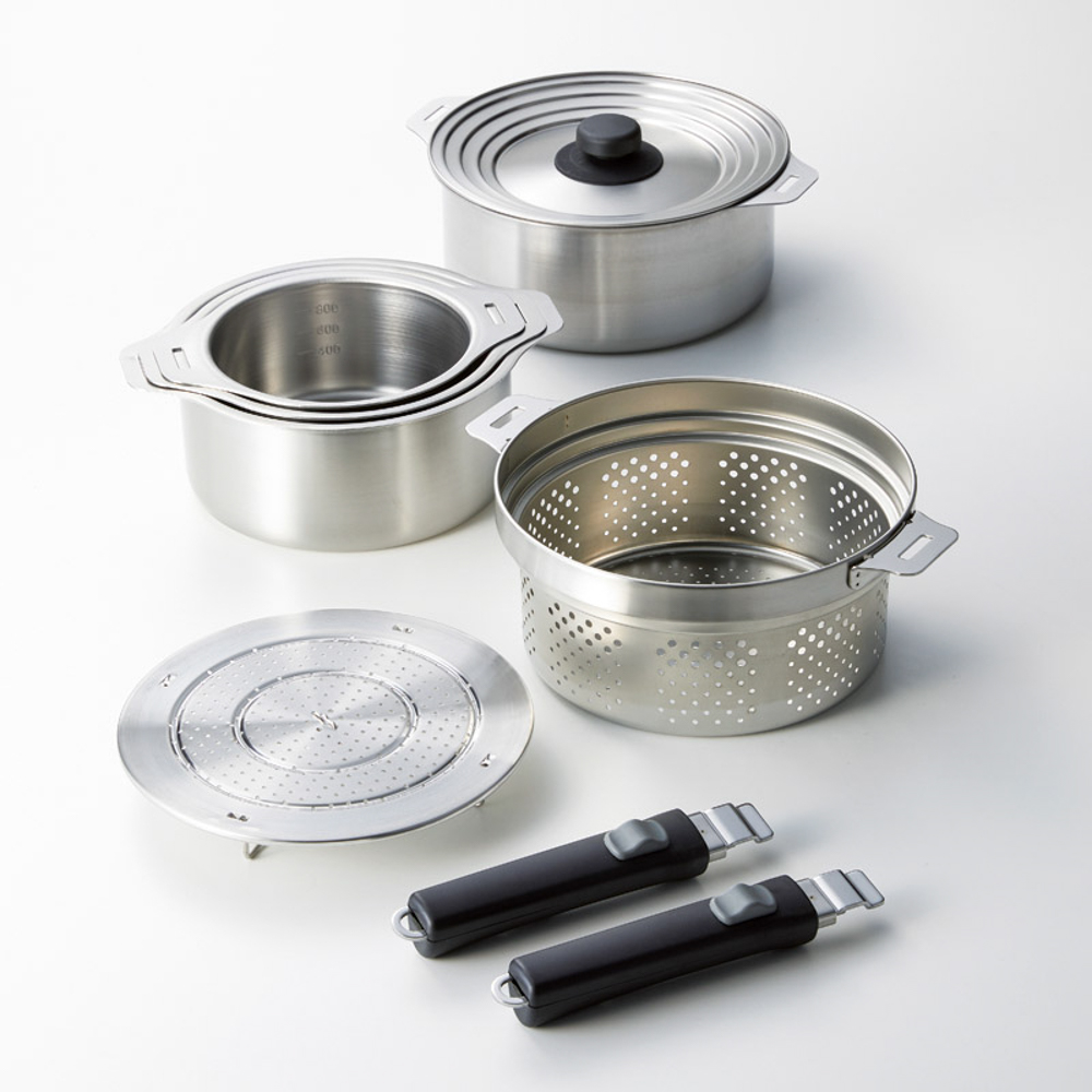 | 内容量 | 鍋14cm(20×15.5×7.3cm・1.1L)・鍋16cm(22×17.5×7.8cm・1.6L)・鍋18cm(24×19.5×8.3cm・2.1L)・鍋20cm(26×21.5×8.8cm・2.8L)・兼用蓋・蒸し台・中かご×各1、着脱ハンドル×2・鍋・兼用蓋・蒸し台・中かご:ステンレス鋼 |