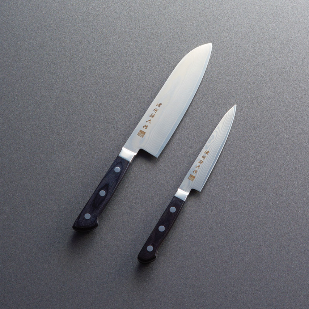 三徳包丁(刃渡18cm)・ペティナイフ(刃渡13.5cm)×各1・積層鍛接複合鋼材、柄:黒色積層強化木