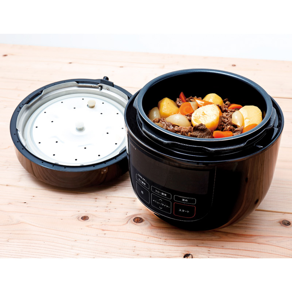 | 内容量 | 26.5×28.2×28.3cm(4L)・本体(26.5×28.2×28.3cm)・計量カップ・蒸し台・内ふた用パッキン(予備)・レシピブック×各1・PP、PA、シリコーンゴム、SUS、鉄 |