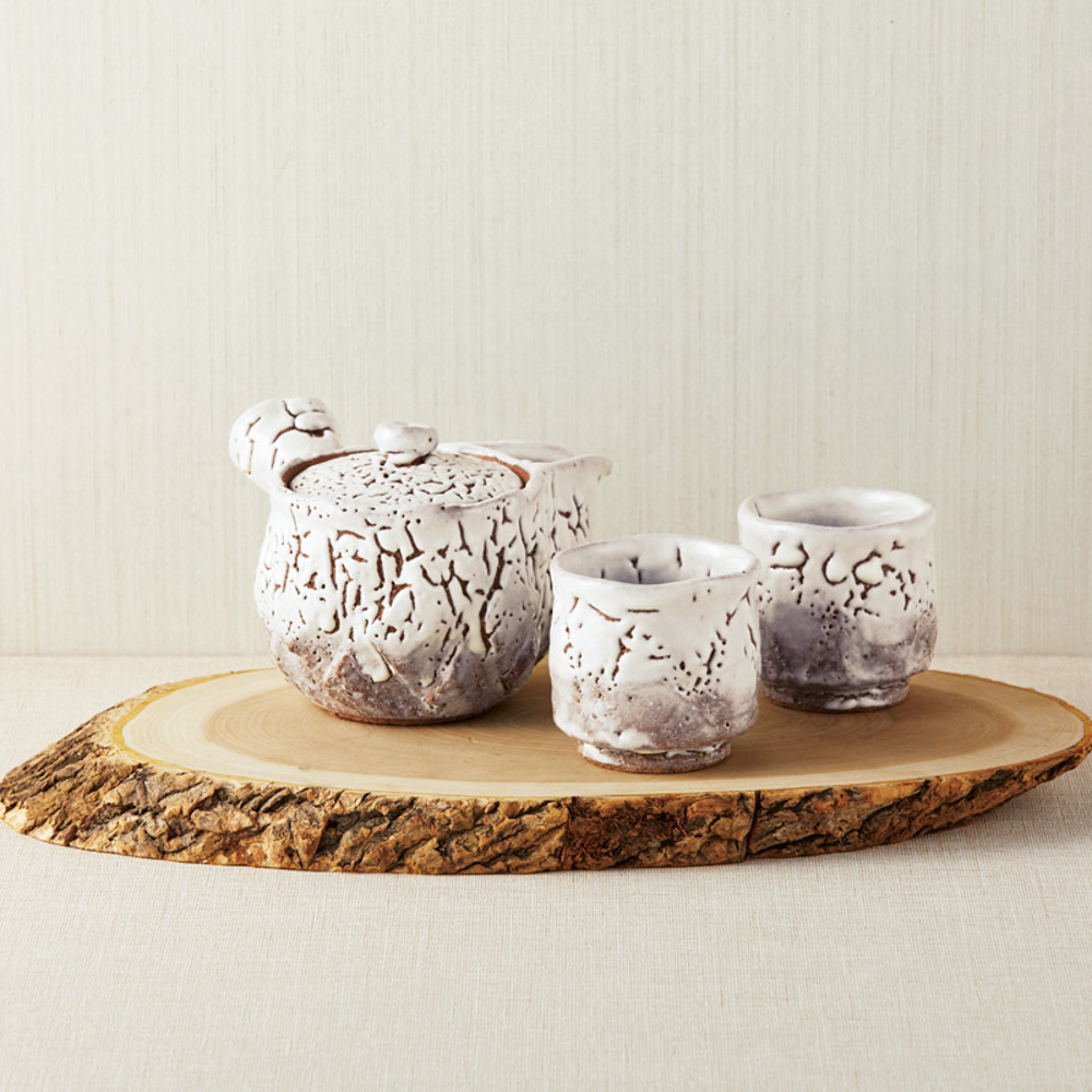 釉薬の縮れを景色にした荒々しさの中に、どこか土ものらしい柔らかさを兼ね備えた味わい深い茶器揃です。