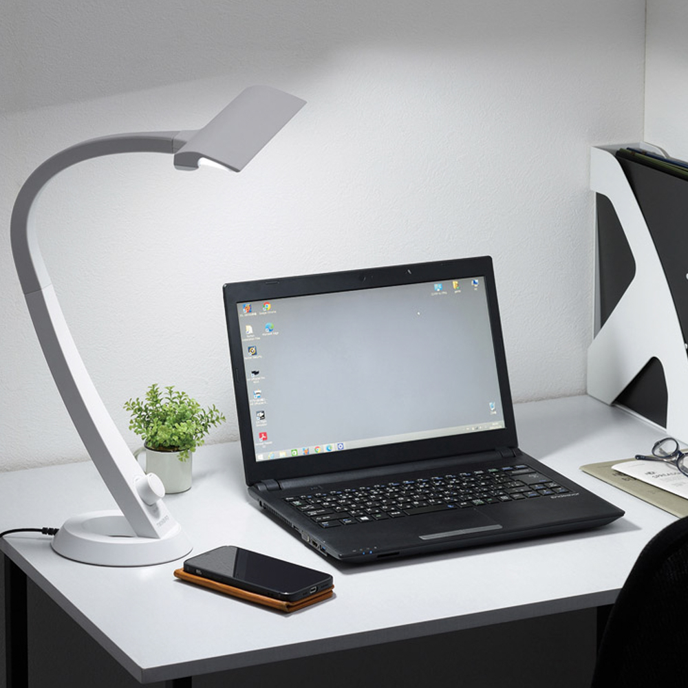 独自技術によって、照度差の少ない均一な光で広範囲を照らします。目に優しい光で長時間のパソコン作業などにもおすすめです。テレワークでも使いやすいコンパクトな台座。前方配光、1025lm。光源:LED、光色:昼白色5000K。JIS照度:AA形相当。コードの長さ約1.8m。消費電力12W。