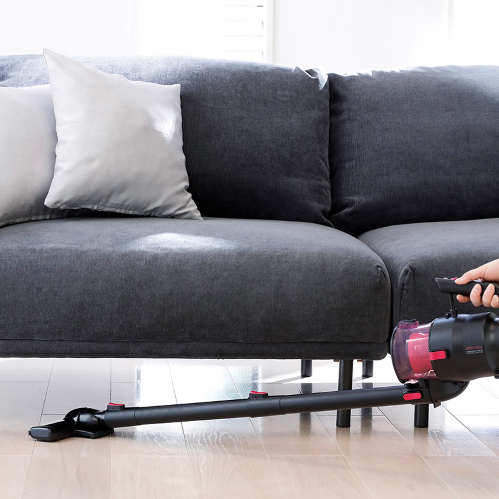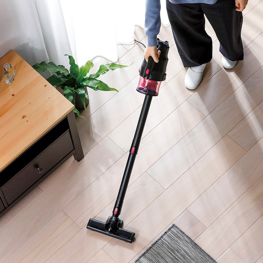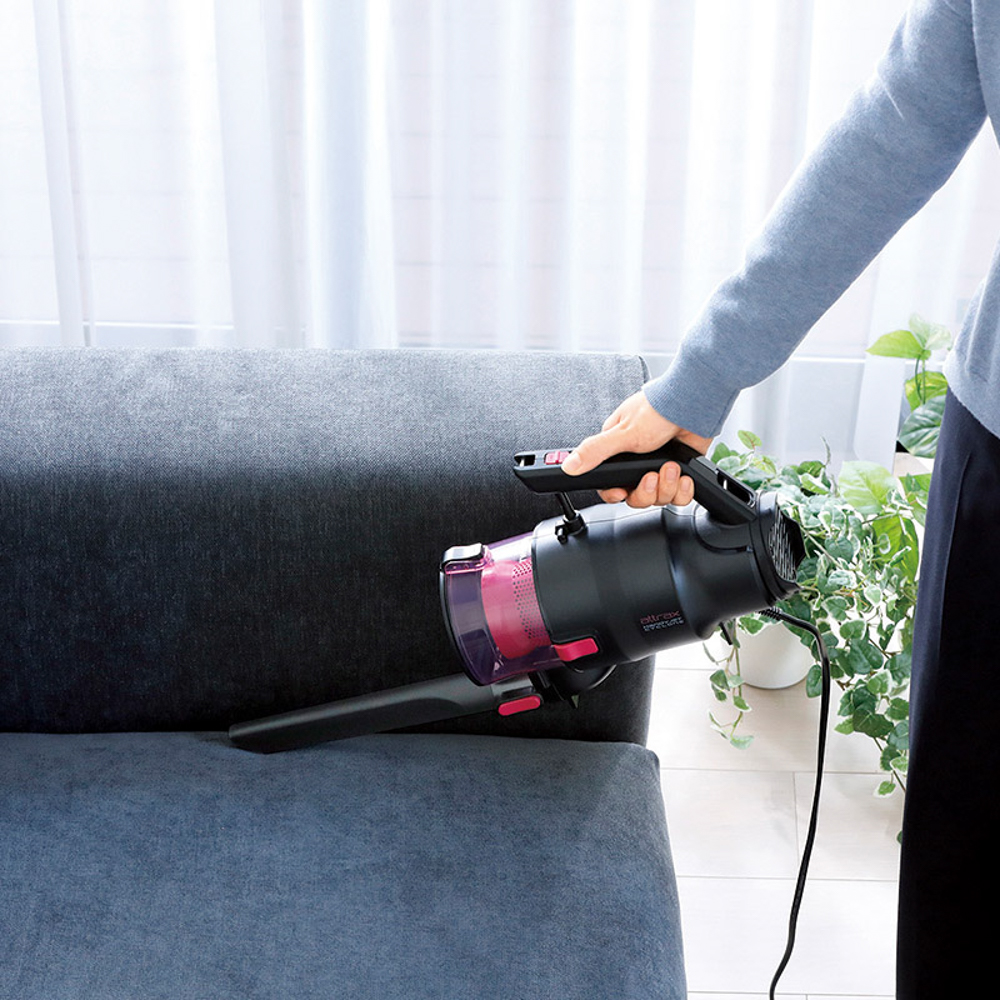 豊富なアタッチメントで家の中も外も1台でお掃除。ごみ捨てが簡単にできる「ラクステ」機能付き。ダストケース全体が外せ、丸洗いできる構造。ベッドやソファーの下も掃除しやすいフルフラット構造。コードの長さ約6m。消費電力750W。