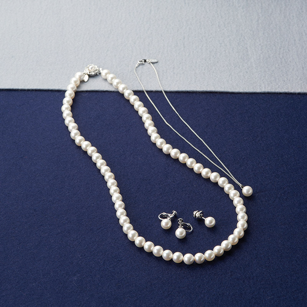 ネックレス(全長約62cm)・ペンダント(全長約40cm)・イヤリング(珠径約0.9cm)・タックピン(径約0.9cm)×各1・真鍮(シルバーカラーメッキ)、貝パール(径約9mm)
