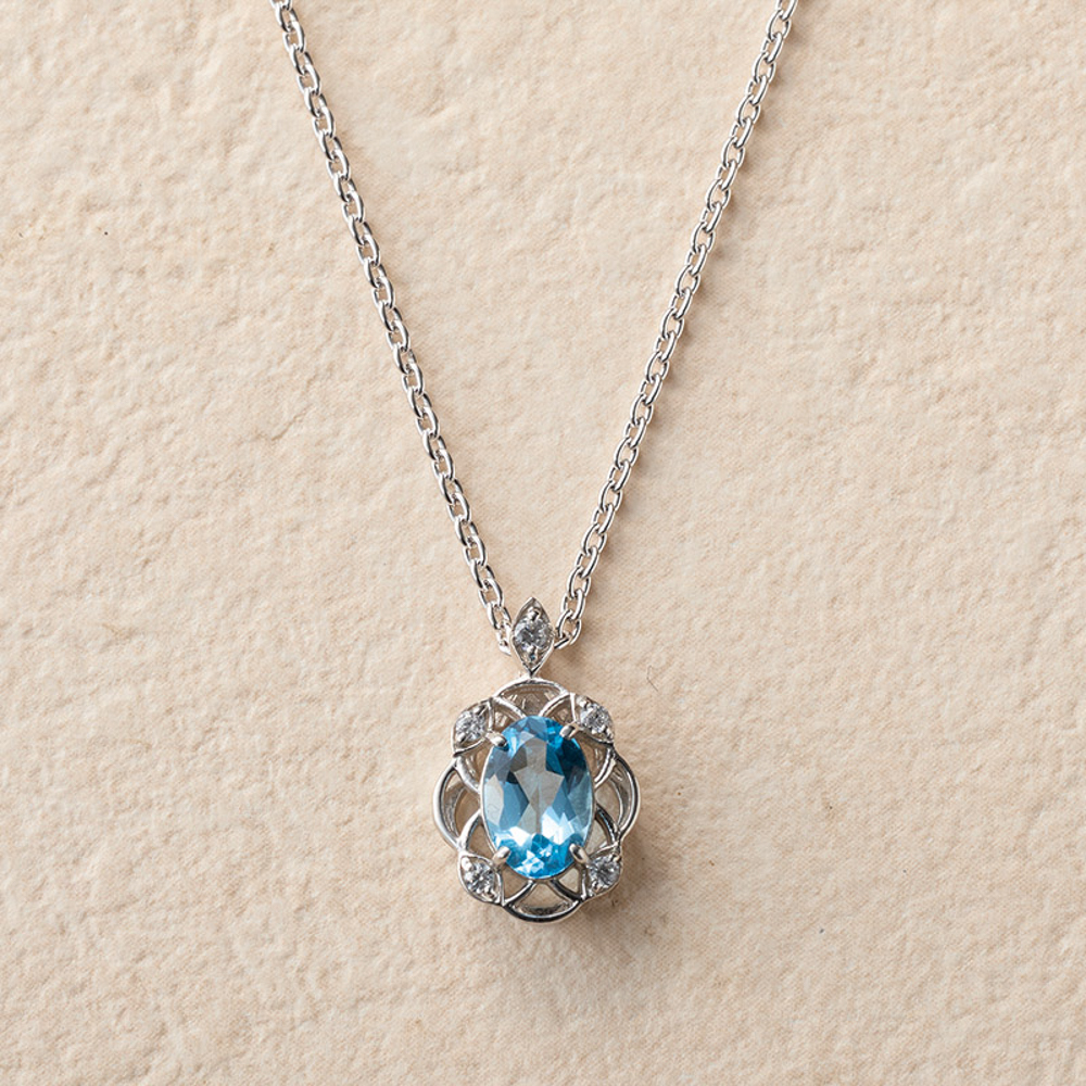透き通ったブルーが印象的なブルートパーズとシルバーフレームのレリーフが調和した上品なペンダントです。