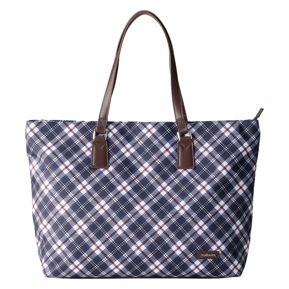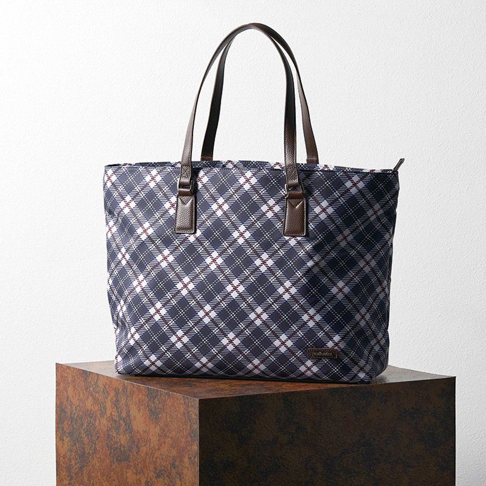 ハウスタータンを全面に使用した大胆なトートバッグ。装いのアクセントに。持ち手は、牛革を使用し高級感をプラスしています。ファスナー開閉式。内ファスナーポケット×1室、内オープンポケット×2室、底鋲×5。持ち手立上り約21.5cm。