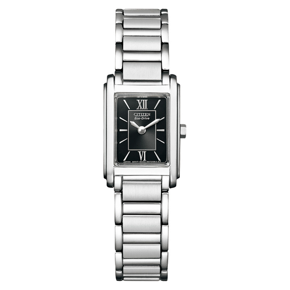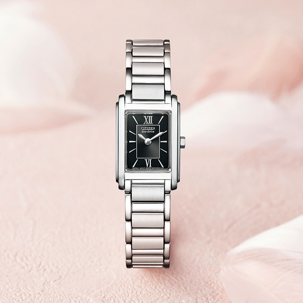 日常使いにも便利なシンプルで見やすい腕時計です。定期的な電池交換が不要なエコ・ドライブを搭載しています。充電警告機能、過充電防止機能、時刻合わせ告知機能、三ツ折れプッシュタイプ。日常生活用防水。フル充電時約1年可動。