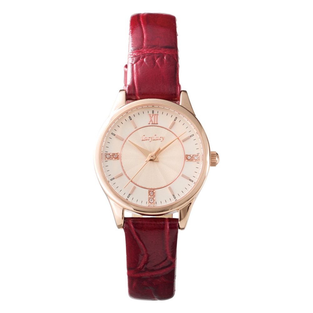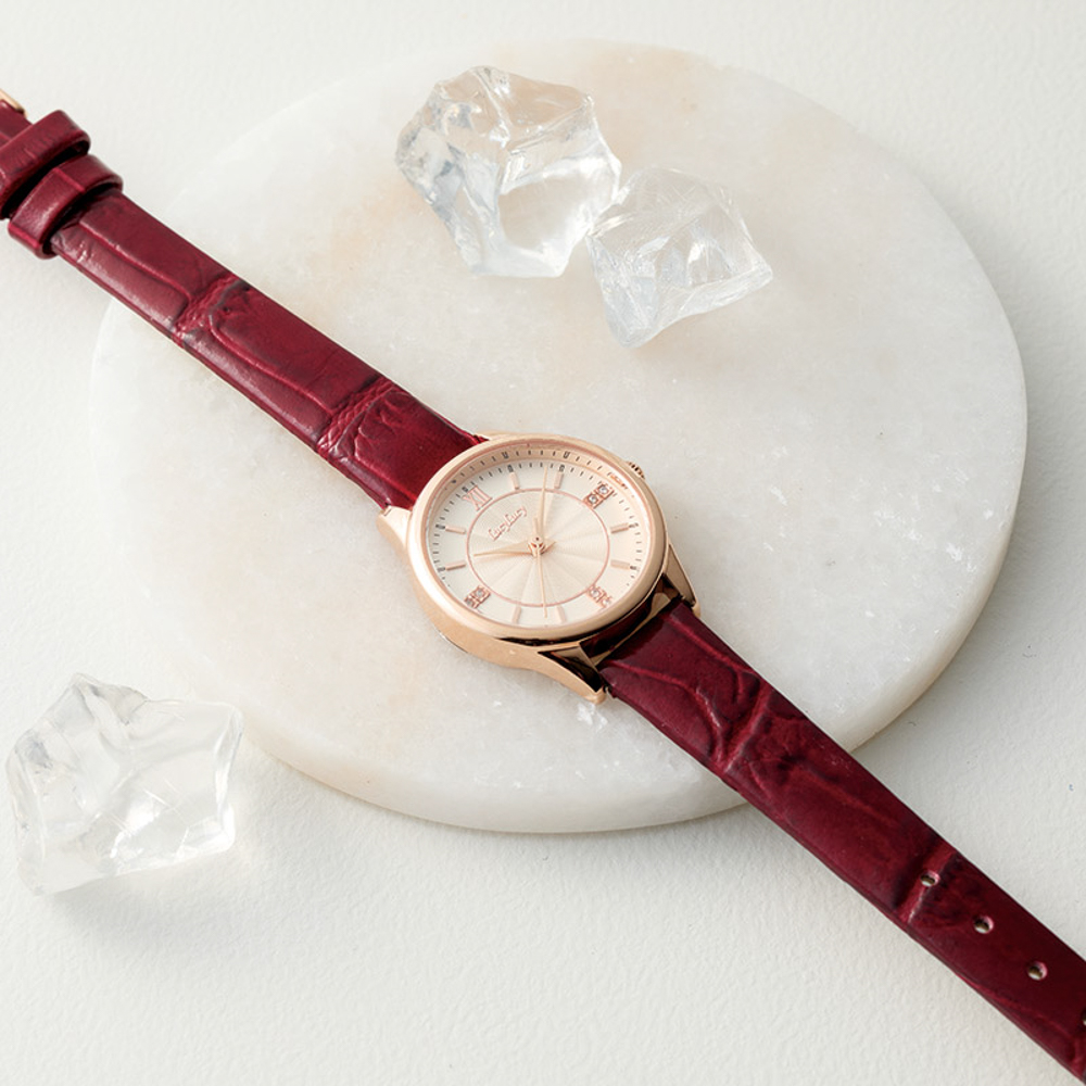 飾らないシンプルな文字盤には6石のダイヤモンドがあしらわれています。ほんのりピンク色の本体とワインレッドのベルトが調和した、文字盤も見やすいドレッシーな腕時計。日常生活防水。電池寿命約1年。ムーブメント日本製。