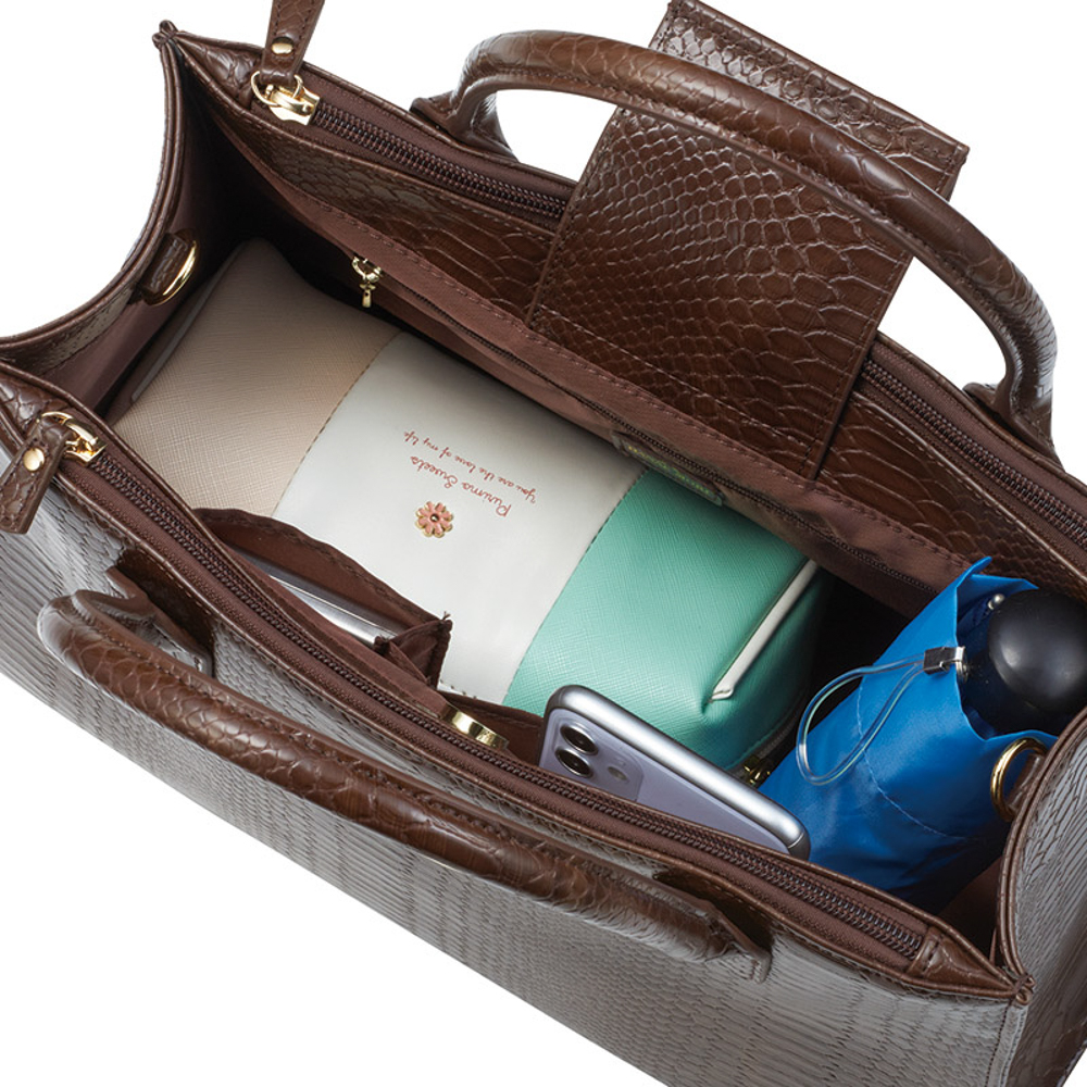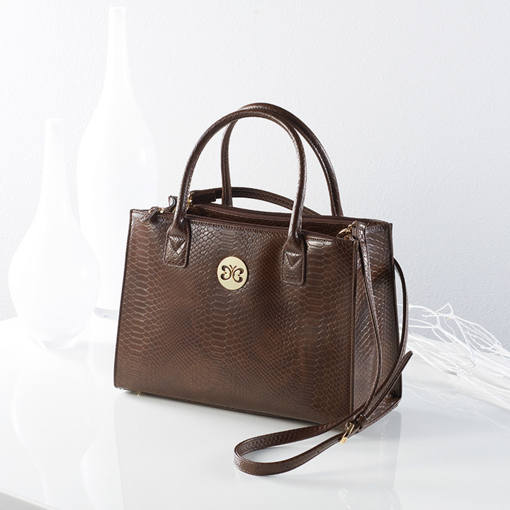 ハナエモリの象徴である「蝶」を表現したメタルをあしらい、パイソン柄がアクセントになっています。ベーシックな作りながらも洗練されたデザインに仕上げました。べロ付マグネットホック開閉式。ファスナーポケット×2室、内ファスナーポケット×1室、内オープンポケット×2室。底鋲×5。持ち手立上り約13cm。ショルダーベルト(着脱可・長さ調節可)付。