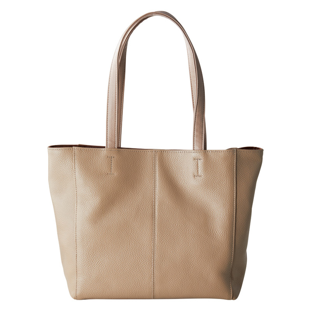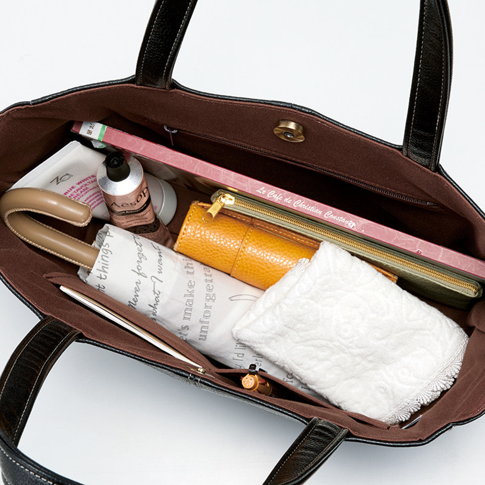 ベーシックなデザインで大きく広いて荷物の出し入れが楽にできる肩掛け可能なトートバッグ。内側3つのポケットで散らばりがちな小物を整理収納。500mlペットボトルや長財布、折り畳み傘などまとめてざっくり収納出来る大きめサイズのバッグです。マグホック開閉式。内ファスナーポケット×1室、オープンポケット×2室。