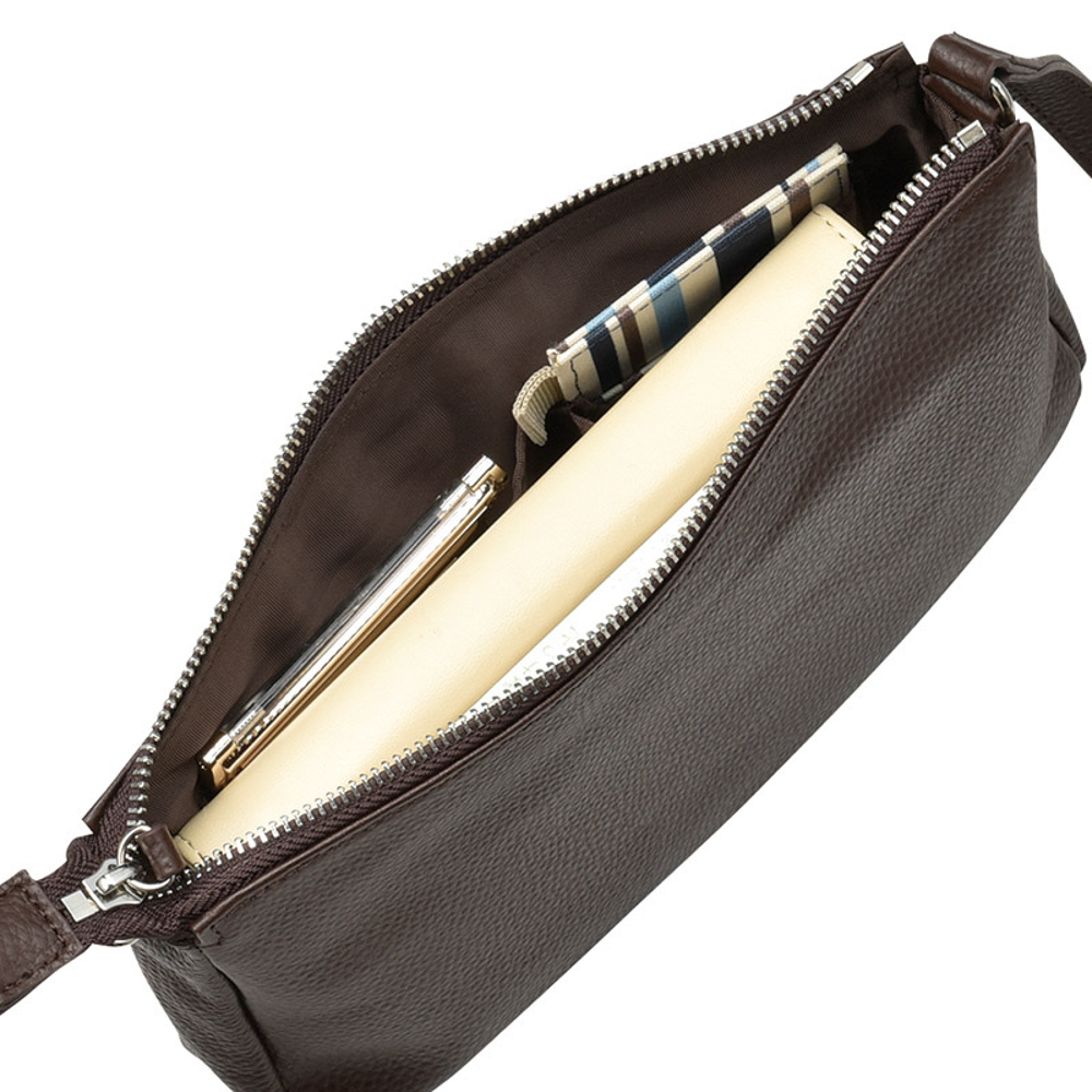 シックなデザインながらも牛革の雰囲気がどんな服装にもマッチし、コーディネートに使いやすいアイテムです。ファスナー開閉式。前面ファスナーポケット・内ファスナーポケット×各1室、内オープンポケット×2室。ショルダーベルト脱着不可(長さ調節可)。
