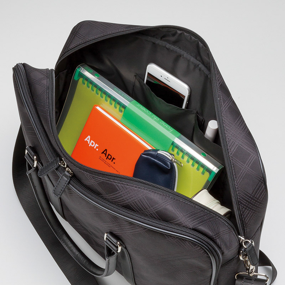 糸の織りでチェック柄を表現した生地は上品な光沢があり、さりげないオシャレのアクセントとして効果的です。Wファスナー開閉式(2室)。前面マグネットホックポケット・内ファスナーポケット×各1室、オープンポケット×2室。底鋲×4。持ち手立上り約13cm。ショルダーベルト(着脱可、長さ調節可)付。