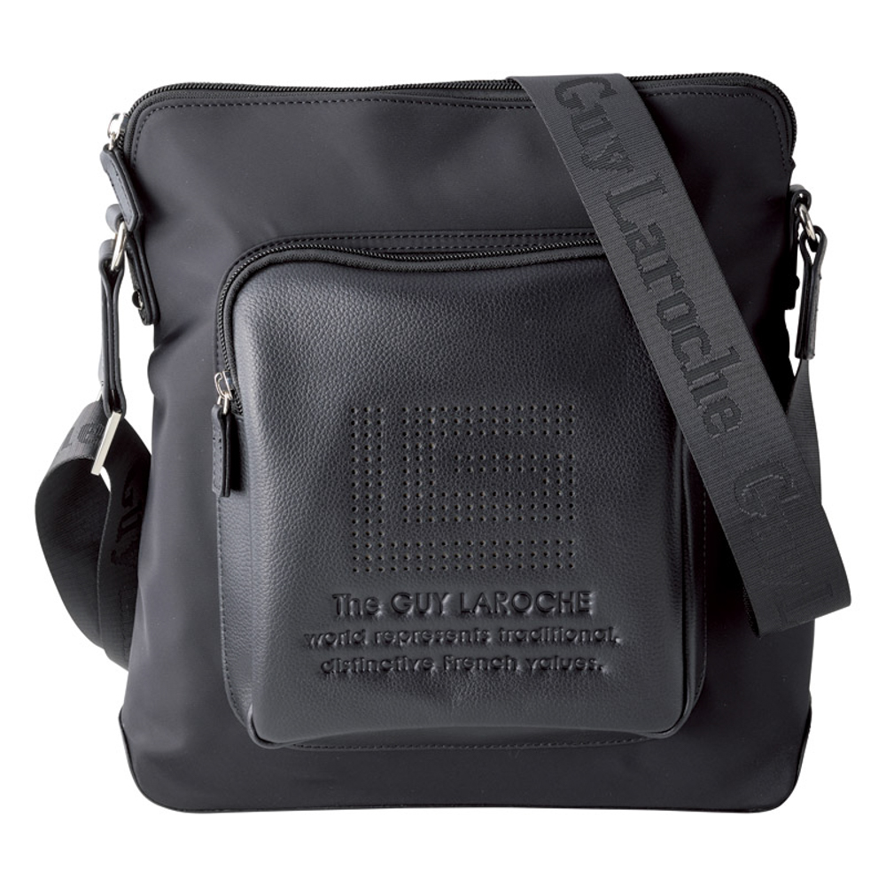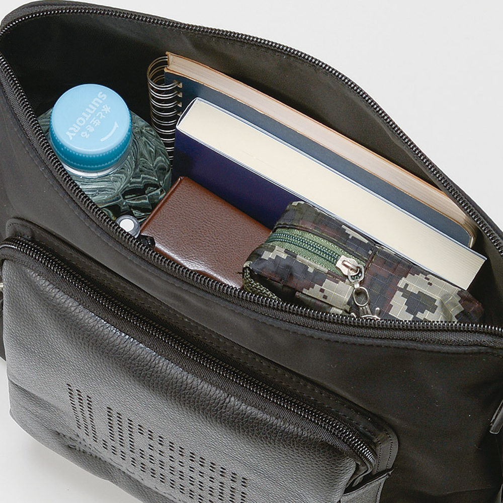 しっかりとした風合いの革にロゴマークをドットでパンチングし、存在感のある印象のアイテムです。ファスナー開閉式。前面ファスナーポケット×1室、内オープンポケット×2室。ショルダーベルト着脱不可(長さ調節可)。