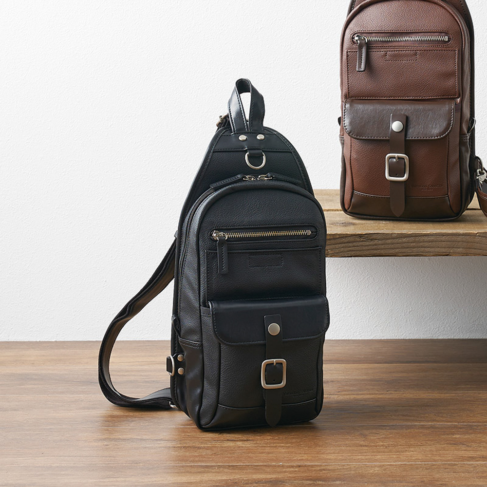 本体は2種類の合成皮革のコンビになっていて、絶妙な質感の違いを感じられます。